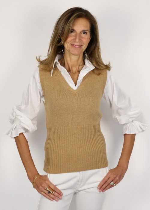 Clean lines and sculpted silhouette for the Sophia vest, designed to enhance femininity with discretion. The deep V-neckline and ultra-slim fit embrace the body with elegance, while the ribbed high-end waist defines and enhances the figure. A sophisticated garment, perfect for completing contemporary looks with a touch of essential refinement.