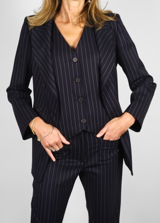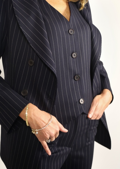 Double-breasted jacket with side cut and flap pockets, refined and feminine.