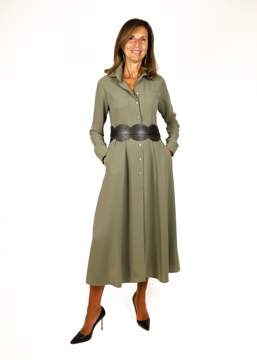 Questo chemisier presenta due taschine sul seno ed è realizzato in cady.
