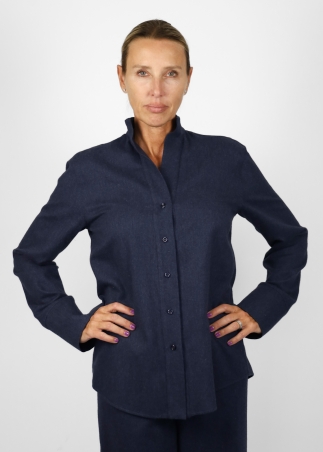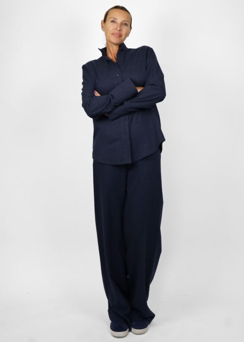 Camicia Capri, dal taglio over con collo in piedi, polsino risvoltabile e dettagli sartoriali, anch’essa in flanella di cotone calda e confortevole.